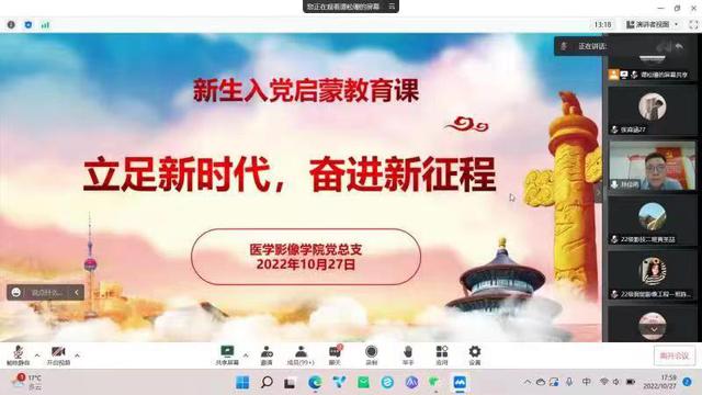 为引导新生树立远大理想,积极向党组织靠拢,10月27日晚上,医学影像公司党总支组织2022级全体新生在线参加入党启蒙教育,党总支副书记乔慧敏、辅导员沈丹丹出席活动,党总支宣传委员、专职组织员谭松珊担任主讲,会议由员工党支部书记孙佳鸣主持。