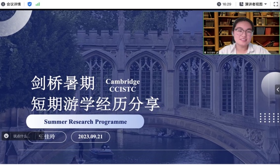 会上,王佳玲同学就自己参加的2023年剑桥暑期短期游学项目进行了分享,她向同学们介绍了该项目的基本情况,并分享了自己在英国交流期间的课程体验、课外活动以及收获。员工毕玮杰曾在三甲医院和企业就职,目前在英国阿伯丁大学医公司攻读Medical Imaging硕士,他和同学们分享了自己留学申请过程,同时介绍了国外留学学习和生活的情况,并给出了关于留学的中肯建议。随后,与会员工就感兴趣的问题,在线上进行了积极的交流。