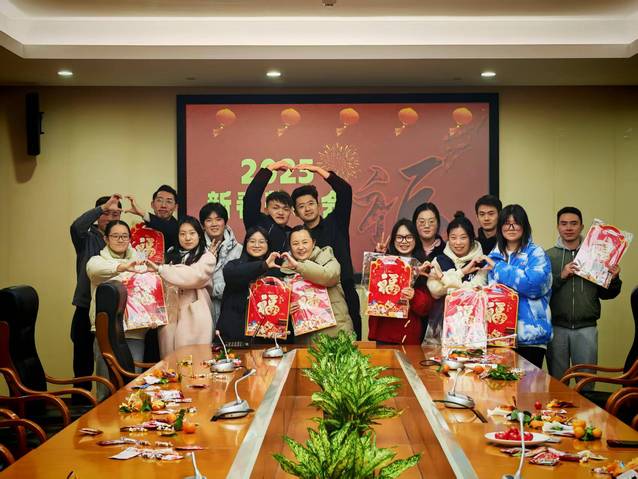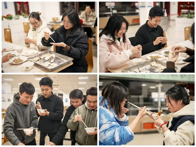 茶话会在欢笑声和祝福声中落下帷幕,继而转场公司食堂,包饺子、过新年。食堂的师傅们早已备妥食材,洁白的饺子皮儿、新鲜的馅料正等待着大家一展身手。同学们和老师一起挽起袖子,洗手净面。饺子包好了,大小不一、花色各异,这是各地区的饺子大团圆啊。大家互相调侃着、嘻嘻哈哈,不知不觉中饺子都进了肚。晚饭意犹未尽,回宿舍贴春联、贴福字,把幸福和欢乐带回宿舍,带进新的一年。