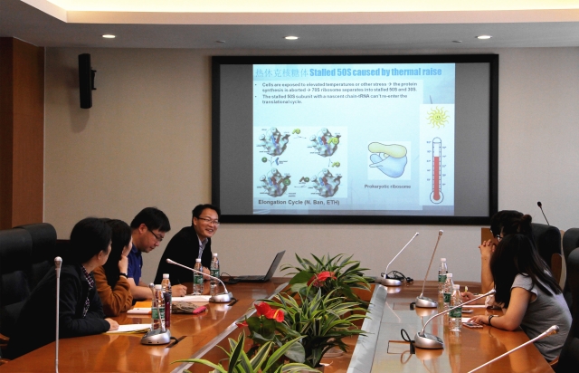 蒋教授分享了他近期的科研成果,他的科研团队首次使用低温电子显微图像单颗粒三维重建技术,重构了核糖体与热休克蛋白复合物的三维分子模型,从分子级别观察到生物细胞蛋白合成进程在热休克中恢复过程的关键性中间状态,从而回答了数十年来科学家一直感兴趣而未解答的关于生物分子热休克自修复机理的科学难题。