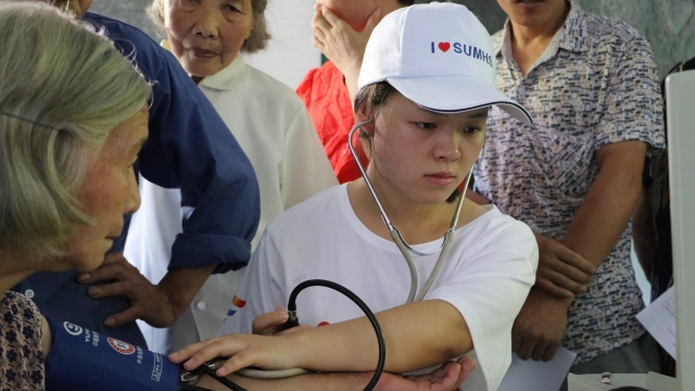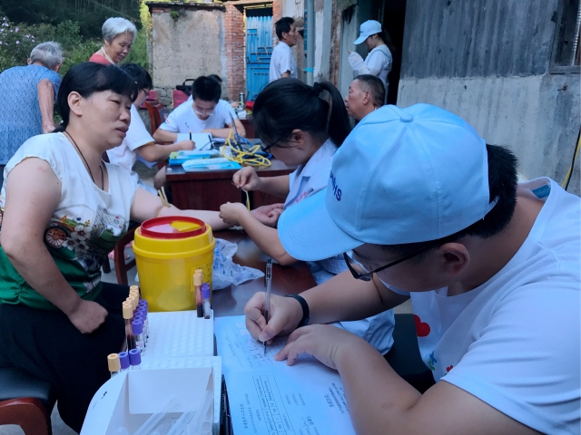 随后四天,弘毅医疗服务队分为两组跟随镇卫生院体检队开展下乡体检,每天他们迎着朝阳出发,头顶烈日归来,为当地百姓进行服务。在丰山村,因临时体检室空间狭小,负责测量血压的同学只能在室外进行工作,炙热的太阳火辣辣地烤在身上,豆大的汗珠从脸庞滑落,但她毫无怨言,默默坚守在自己的工作岗位上。山里体检场地极为简陋,B超和心电图检查只能在毫无遮掩的废弃床铺或者长桌上进行。同学们经过前几日医院的培训,已经能熟练地为村民们进行检查,一次次地弯腰,一次次地操作,即使腰酸,即使背痛,也没有人喊苦喊累。在连续多日的体检中,服务队与镇卫生院体检队分工明确,配合默契,同学们有的协助医生问诊,有的帮助护士抽血,有的负责测量血压、视力、身高和体重,有的协助技师进行B超和心电图检查,场面有条不紊,体检进行的非常顺利。