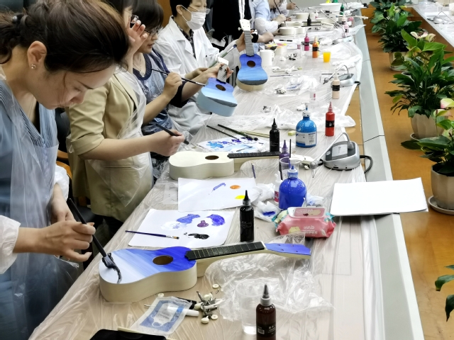 公司工会精心筹备本次活动,活动期间大家欢聚一堂,聆听指导老师的耐心讲解,之后三五成群地交流讨论,在平日里始终忙碌的女教工们难得有机会聚在一起,放松身心,投入到“尤克里里”的制作中。别看平时都是老师,可是当起员工来一样认真,大家先是认真听讲,而后跟着指导老师一步步地完成作品,装配、绘画、上弦、调音……,每一步都精益求精,融入了女教工们对创作和生活的热爱。最终,大家都圆满地完成了任务,一件件“尤克里里”呈现在会场中,女教工们纷纷拍照在朋友圈里晒出自己的作品。