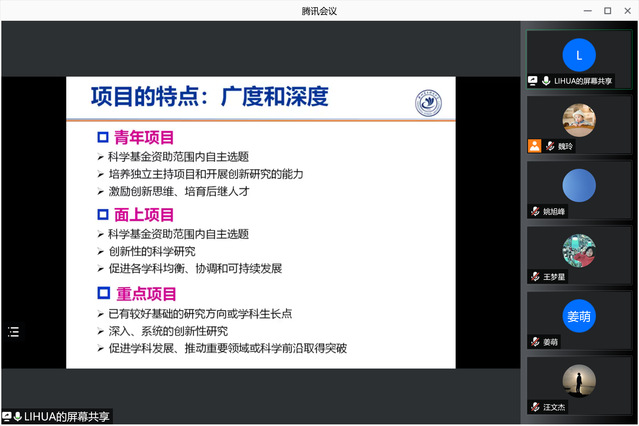 会上,厉教授主要分享了国家自然科学基金项目申报的认识和体会。厉教授从国家自然科学基金不同类型项目的广度和深度出发,分析特点;并介绍了基金申请书撰写中的几点要素。厉教授认为实力是基础,写作是关键,写申请书不仅是为了申报项目,而是对研究工作的思考和规划。申报书要早做规划,仔细打磨,认真撰写。