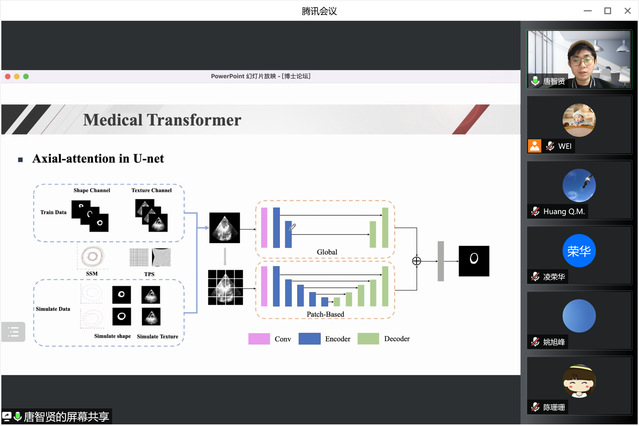唐智贤博士以《Attention U-net及其改进在医学图像分割中的应用》为题,围绕“Attention gate”、“self-attention & multi-head attention”、“axial-attention”三个注意力机制的概念展开论述,对上述不同机制进行分析,找出问题并提出解决方法,并将这些机制应用在病理图像细胞核分割、前列腺MRI图像分割和心脏超声图像分割中,取得了良好的实验结果。在交流互动环节中,公司多位教师针对attention U-net的临床应用以及科研中遇到的图像处理的问题与唐老师进行交流,针对参会师生所提出的疑难问题,唐老师也一一进行详解,现场科研气氛活跃而热烈。