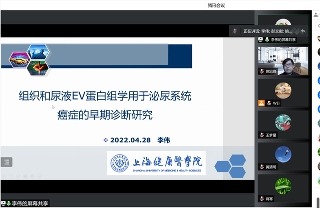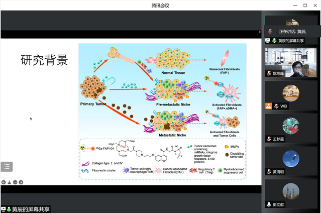 会上,李伟博士以《组织和尿液EV蛋白组学用于泌尿系统癌症的早期诊断研究》为题,交流了泌尿系统肿瘤诊断可以借助组织和尿液EV蛋白组学分析,并展示了前期相关的研究成果;黄辰博士以《68Ga-FAPI和18F-FDG在乳腺癌转移动物模型中检测转移》为题,汇报了前期研究成果。通过比较分析发现68Ga-FAPI在检测早期肺转移中比18F-FDG更早能发现病灶,但是随着转移的进展18F-FDG则显示出较大优势。两位老师从解决临床重点和难点问题出发,聚焦于肿瘤早期发现,利用现代生物影像技术揭示疾病的发生、进展与转归,具有重要的临床价值。