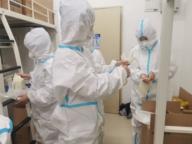 在上岗实践培训期间,同学们跟随附属崇明医院的3名医护人员掌握了很多操作技能,其中包括穿防护服、正确佩戴护目镜、N95口罩、内外层手套、头套,脚套等。接着就是学习了采样最重要的口咽、鼻咽拭子的采样方法、棉签的握法,采样部位等,其中鼻咽拭子的学习比较难以把握,所以为了更加熟练掌握鼻咽拭子的采样方法,同学们晚上在寝室里互相采样练手。每天学习、实践操作内容繁多,但是同学们始终保持积极饱满的精神状态来迎接每天的培训和操作。同学们表示:只要公司需要我们坚守,我们就安安心心坚守岗位,请公司放心,岗位有我,健康有我,竭尽全力守护公司平安,为公司的疫情防控常态化管理贡献绵薄之力。