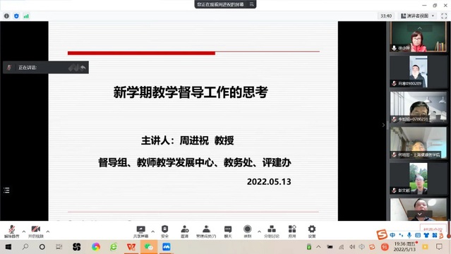 5月13日召开best365体育亚洲2021-2022第二学期线上教学督导研讨会,研讨会上各位督导对本学期督导情况进行了总结,校级督导周进祝教授从本科合格评估的角度对督导工作内容,职责进行了指导。总体而言,本学期受疫情影响采取线上教学模式,整体教学情况平稳有序,教学资源建设较以往更加充分,大部分教师采用腾讯直播方式与学习通结合方式,效果较好;但也存在一些问题,比如部分老师采取录播方式,教学效果稍差,且不方便进行课堂教学督导工作;个别外聘兼职教师存在教学规范性较差问题,有待进行岗前培训;实验课的开展受线上条件制约受到影响等。针对以上问题,公司将在外聘教师的岗前培训、督导专业度、联合培养、实习等环节的疫情应对策略进行工作开展和研讨。