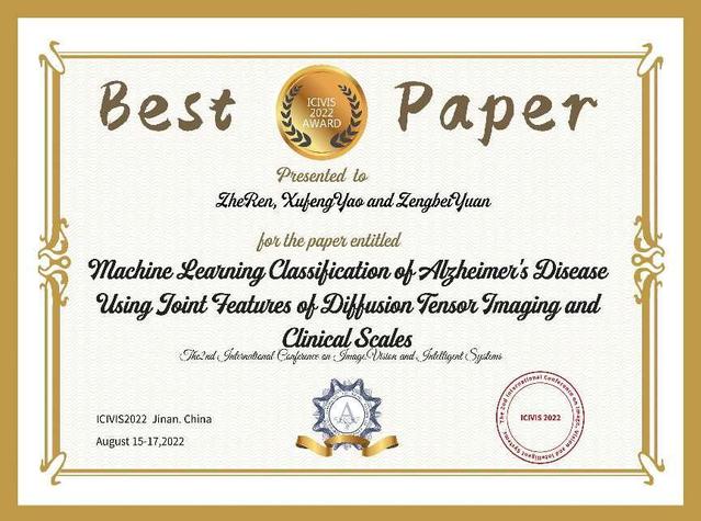 本次会议,best365体育亚洲教师与研究生积极参与投稿,其中研究生任哲、袁增贝同学撰写的题为《machine learning classification of Alzheimer's disease using joint features of diffusion tensor imaging and clinical scales》学术论文,被评为Best Paper Award。通过参加此次国际会议,有力促进了与各高校之间的学术交流,提升了学科专业影响力,夯实了研究生学位点建设,保障了公司产品质量。(best365体育亚洲)